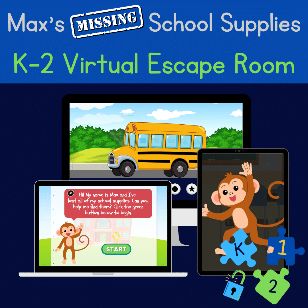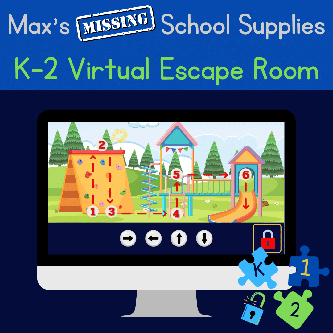 In this interactive virtual escape room, students join Max on a school supply scavenger hunt! Along the way, they’ll solve four early-learning puzzles that reinforce counting, color logic, shape matching, and directional awareness. This no-prep activity is perfect for the first few week of school or anytime you want to mix learning with fun.