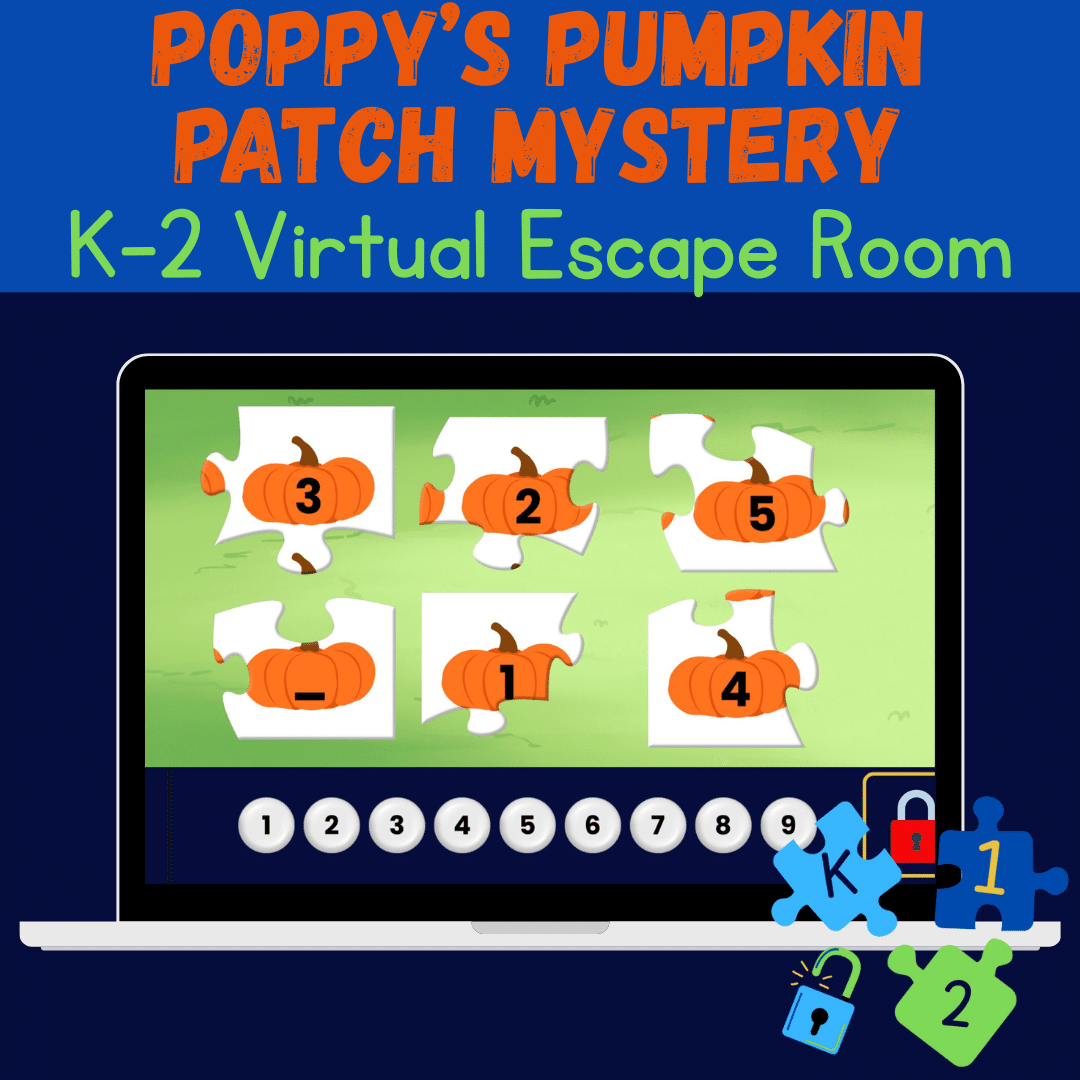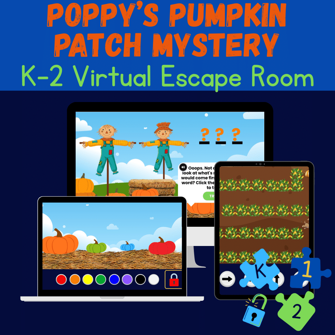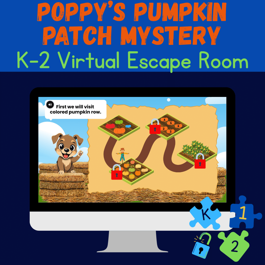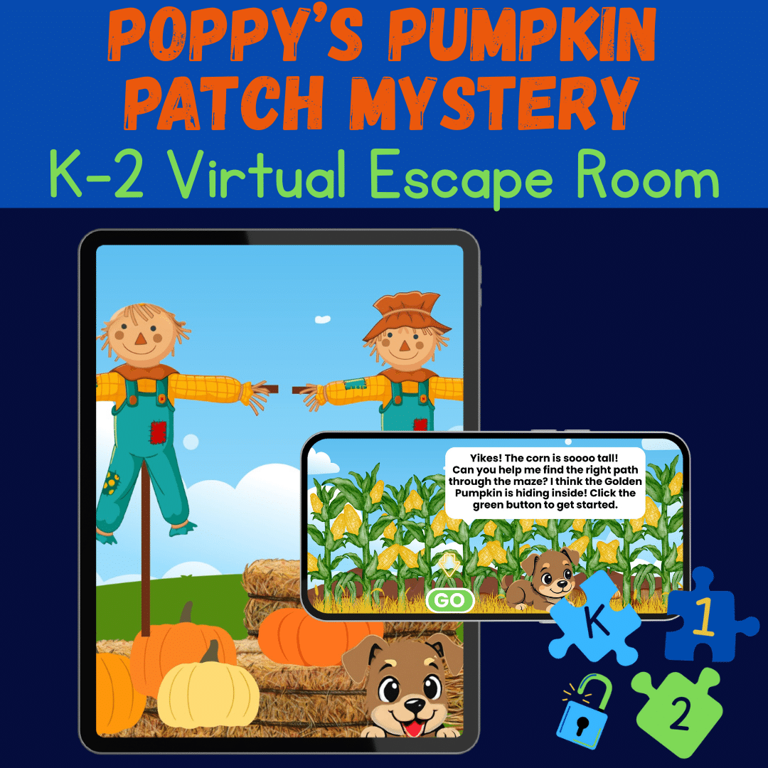 In this interactive, kid-friendly virtual escape room, students will join Poppy the Puppy on a fall-tastic adventure through the pumpkin patch to find the missing Golden Pumpkin! Along the way, they’ll solve logic puzzles, sort colorful gourds, and navigate a corn maze—all designed with early elementary learners in mind. Perfect for fall fun in K–2 classrooms or at home!